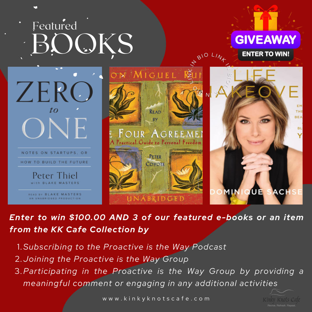Our quarterly giveaway has arrived! KK Cafe’s Proactive is the Way is giving away $100.00 AND 3 of our featured books highlighted within each of our Podcast series or you can select an item from the KK Cafe Collection!